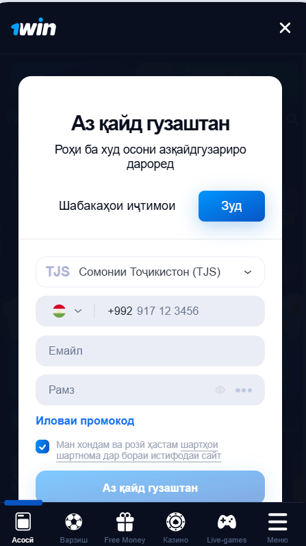 | Дастгирии муштариён | Чат дар сомона ва замима, WhatsApp: +992 00 199 1777, Email: support@1win.xyz |