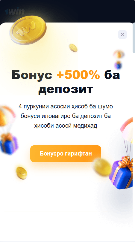 1win — ин як платформаи машҳур барои шартгузорӣ ва казинои онлайн дар Тоҷикистон аст. Бозингарон метавонанд аз зиёда аз 40 намуди варзиш ва киберварзиш истифода баранд. Платформа сомониро дастгирӣ мекунад, имкониятҳои гуногуни ворид ва хориҷ кардани маблағро пешниҳод менамояд, ва интерфейси он бо забонҳои русӣ ва тоҷикӣ дастрас аст, ки истифодаи онро ниҳоят осон мегардонад.Навкорон метавонанд аз бонуси саховатомези истиқбонӣ — 500% барои 4 пасандози аввал, дар маҷмӯъ то 6390 TJS — баҳра баранд. Барои ин, танҳо сабти ном дар сомона ё замима ва ворид кардани маблағ лозим аст. Барои бозингарони доимӣ барномаи вафодорӣ мавҷуд аст: кешбэк то 30%, бонус барои экспресс ва дигар пешниҳоди фоиданок.