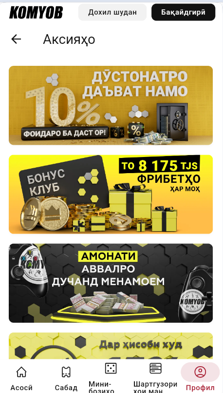 Бонус барои бақайдгирӣ дар Komyob то 1000 TJS ва рамзҳои таблиғотӣ