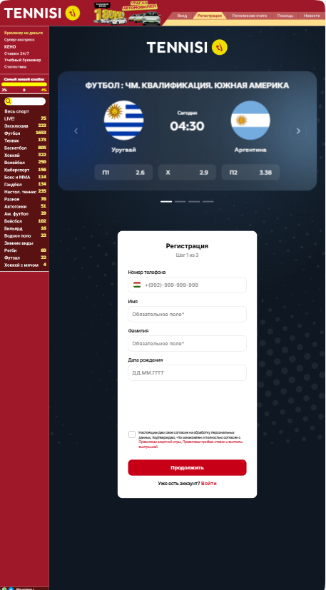 Tennisi — ширкати боэътимоди букмекерист бо иҷозатномаи Тоҷикистон. Ин кафолати риояи стандартҳои баланди амният ва бозии одилона мебошад, ки маълумоти шахсиро муҳофизат мекунад ва пардохтҳоро саривақт таъмин менамояд. Ба шахсони ноболиғ ва онҳое, ки вобастагӣ ба бозӣ доранд, иҷозати шартгузорӣ дода намешавад.